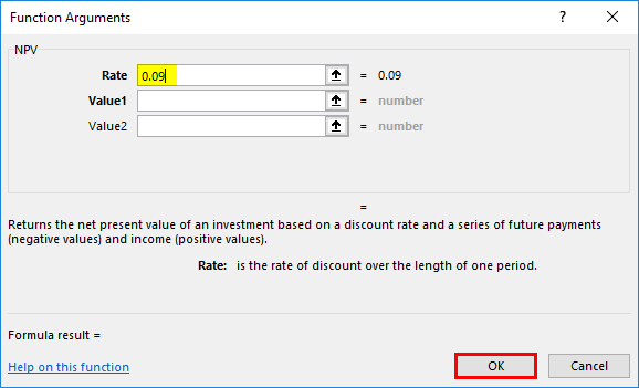Click ok after entering the two arguments. ‘=NPV(0.09,B7:B11).