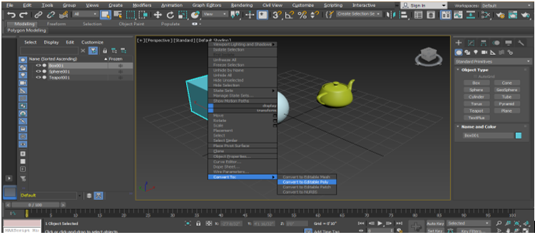 For the next shortcut, we will click on the box model to select and right-click on it; a drop-down dialog box will open, go on the Convert to option. Click on the Convert to Editable poly option.