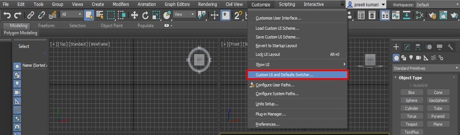 Step 9: You can change the theme of the working screen of the User Interface of this software. For changing the theme of the screen, go to Customize Menu of a Menu bar, which is at the top of the working screen of this software. A drop-down list will be open. Click on the ‘Custom UI and Default s Switcher’ option of the drop-down list.
