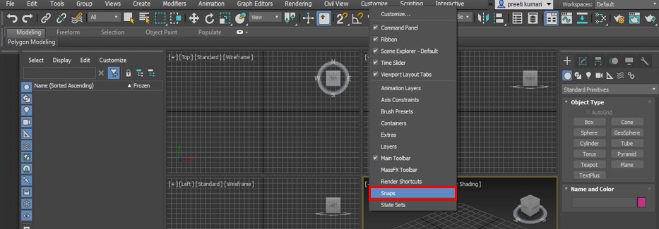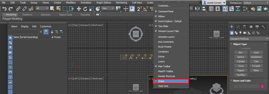 Step 18: You can have a separate panel of any tool. For a separate panel of any tool, make right-click on Customize menu of the Menu bar. A drop-down list will be open. Click on any tool which panel you want to separate. I will click on the Snap tool.