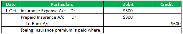 Company ABC Inc. has taken an insurance policy to insure the plant & Machinery of the business. Where the insurance premium of $600 is paid on October 1, 2019 for the financial year 2019-20. Now in the books of accounts, only 50% of payment will be recognized as an expense of insurance premium whereas the 50% amount will be regarded as the prepaid insurance premium. Therefore, entry for the same transaction will be: