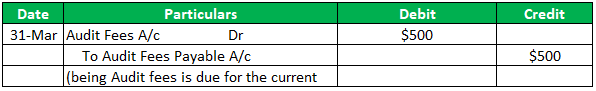 In the companies, even the audit fees are paid to the concerned person who is conducting the audit of the company. Continuing the above example the company pays audit fees amounting to $500 to the auditor for the FY 2019-20 in April 2020. So at the end of the FY 2019-20, the provision for audit fees is to be made when an accrual basis is followed. The entry on March 31, 2020, will be: