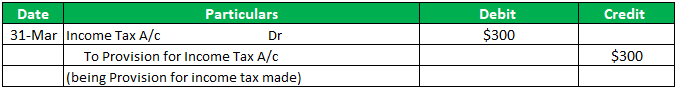Continuing example 5, if ABC Inc.’s tax liability pertaining to FY 2019-20 Is estimated to be $300. Then the provision for the income tax has to be made at the end of the financial year regardless of the fact that the payment is made in advance or some amount is to be paid after the end of the financial year. Therefore, the entry for the same will be