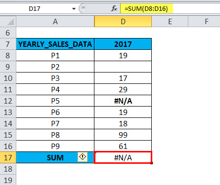 In column D, for the 2017 yearly sales data. In the range D8:D16, cell D9 is a blank cell or hidden row & D12 contains an error value (#N/A). In the AGGREGATE formula, when an appropriate option is used, the AGGREGATE in Excel gives the correct SUM value, neglecting the hidden row & error value.
