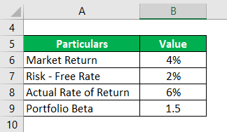 Let us take the example of a Portfolio with a Beta of 1.5 that generated an Actual Return of 6% during last year. If the current Market Return is 4% and the Risk-Free Rate is 2%, then calculate the Alpha of the Portfolio.