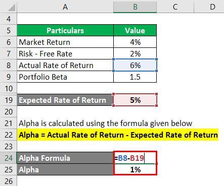 | Alpha Formula = | Actual Rate of Return – Expected Rate of Return |