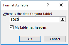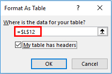 After selecting the range for the table, make sure that “My table has the header” is enabled. Click Ok so that we will get the below result as follows.