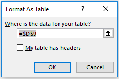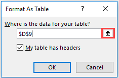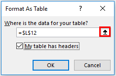 Now, checkmark the “My table HAS HEADERS” because our sales data already had SKU headers, Product title, etc. Next” we need to select t”e range selection for the table. Click on the red arrow mark as shown below.