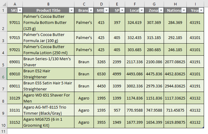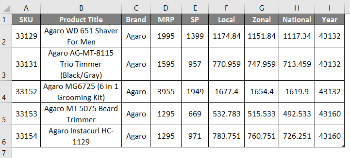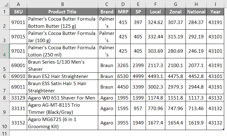 In this example, we will see how to apply alternate row colors using conditional formatting. Consider the below example, which has raw sales data with no row color, which is shown below.
