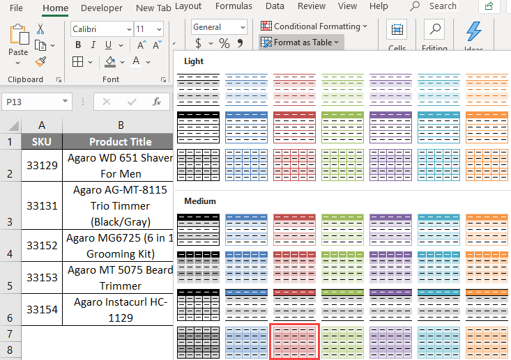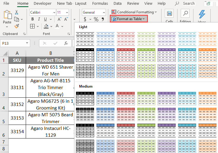 The above screenshot shows that various table styles come with the option like Light, Medium, and Dark.