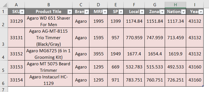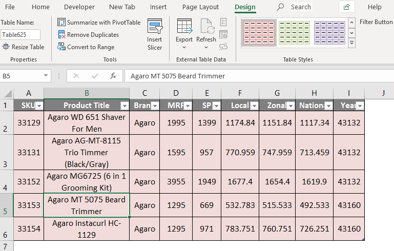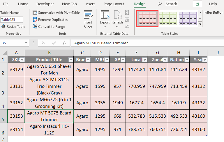 In the below result, we can notice that the row color has been changed to light pink because of the removal of Banded Rows.