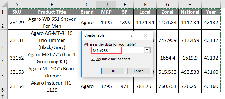 Now, checkmark the “My table has headers” because our sales data already has headers named SKU, Product title, etc.