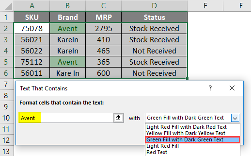 Now in”the dialog box, give the text name on “the right-hand side”, and we can see the drop-down box on the left-hand side where we can choose text color for highlighting. In this example, give the text name Avent and choose the “Green fill with Dark Green Text” shown below.