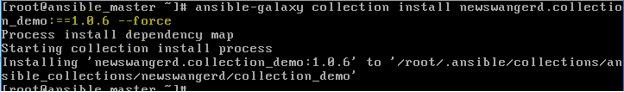 Explanation: – In the above example, it installs version 1.0.6 of a collection called newswangerd.collection_demo. We need to specify –force option to override the collection if already exists.