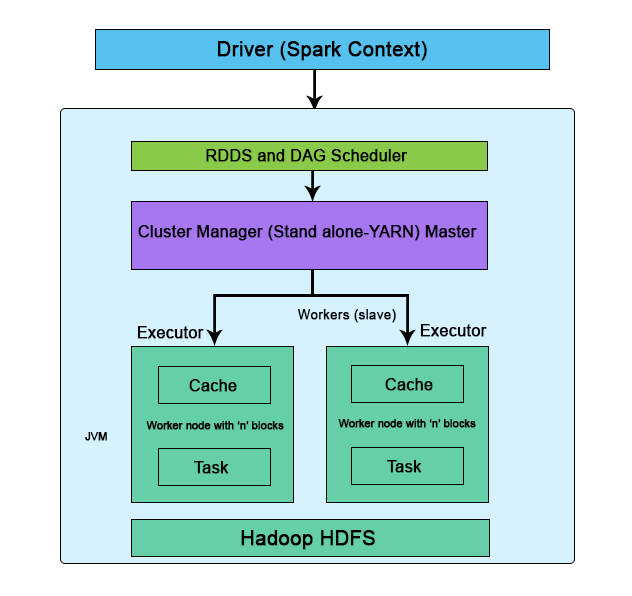The driver’s responsibility is to coordinate the tasks and the workers for management. It’s an Application JVM process and is considered a master node. A driver splits the spark into tasks and schedules to execute on executors in the clusters. In the diagram, the driver programs invoke the main application and create a spark context (acts as a gateway) collectively monitor the job working within the given cluster and connect to a Spark cluster All the functionalities and the commands are done through the spark context.