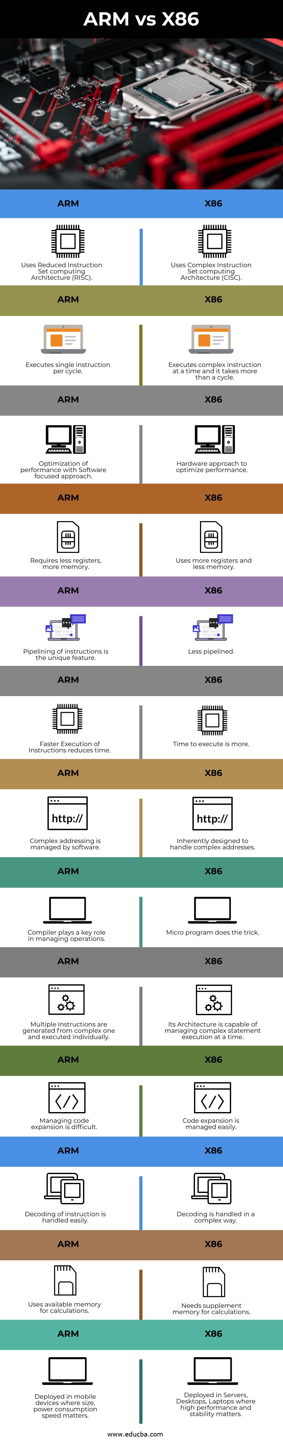 This is a guide to ARM vs X86. Here we discuss the ARM vs X86 key differences with infographics and comparison table. You may also have a look at the following articles to learn more –