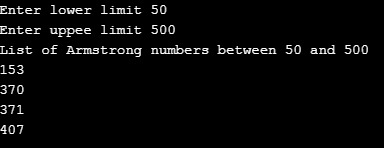 Here we have written a program to print the Armstrong number between two numbers entered by the users. The lower limit takes the minimum number, and the upper limit takes the maximum number. If the upper limit number is small, then the lower limit throws an error. The upper limit number should be greater than the lower limit. We store each number between the interval in the variable ‘temp_num.’ Then we retrieve each digit of the number in variable ‘r’ and find its cube. We then add the result of cubing the digit to the result of the last digit. Likewise, we traverse each digit, and when the traversal is complete, we compare the sum with the original number, i.e., i. If they are equal, then it prints the number.