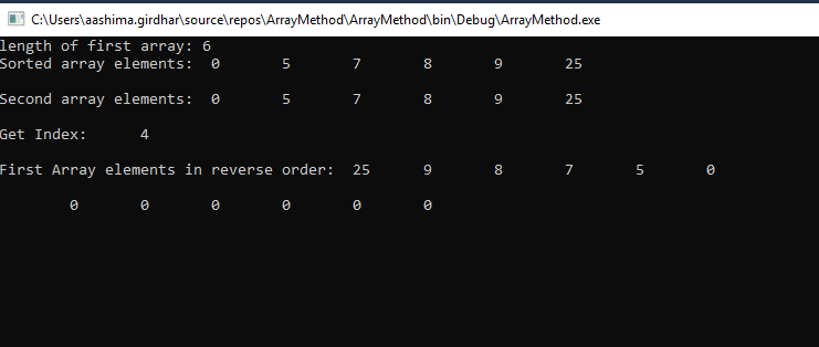 Code Explanation: The above code shows several methods of the array in which arr. Length is used to get the length which is equal to 6, Array. Sort gives the values in sorted form. Array. Copy copies the values from the first array to the second array. Array. The reverse displays the array in reverse order, whereas Clear sets the default values of the elements.
