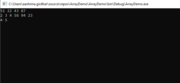 Code Explanation: In the above code, rows and columns are specified with three rows and four-column and Console.WriteLine displays all the values.