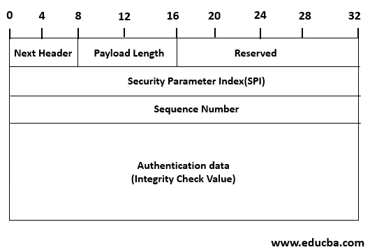- Authentication Data: This variable-length field contains the authentication data, called an Integrity Check Value of (ICV) for the datagram. This value is used for integrity, and authentication purpose is in MAC form. For example, For the IPV4 datagram, this field is an integral multiple of 32; for the IPV6 datagram, this field is an integral multiple of 64. Integrity Check Value is calculated by generating MAC using the HMAC digest algorithm.