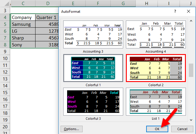 - An autoformat dialog box will appear, which will display 16 different formatting styles.