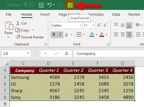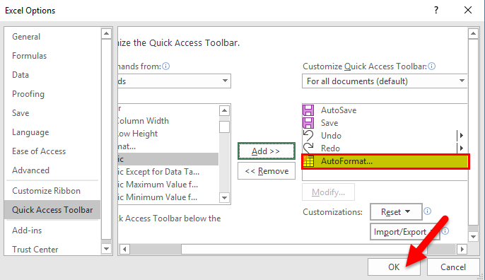 AutoFormat option was available in the previous versions of Excel. In the versions of 2007 Excel and onwards, this option must be added manually, as it is not in any of the tabs option or on the Quick Access Toolbar. The steps to be followed to add AutoFormat function in Excel are as follows: