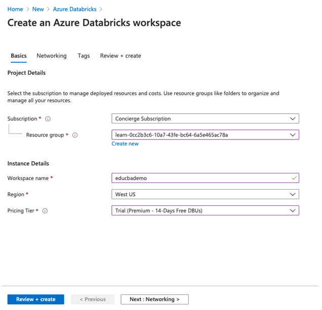 - Workspace name: Enter the unique name for the databricks workspace instance.