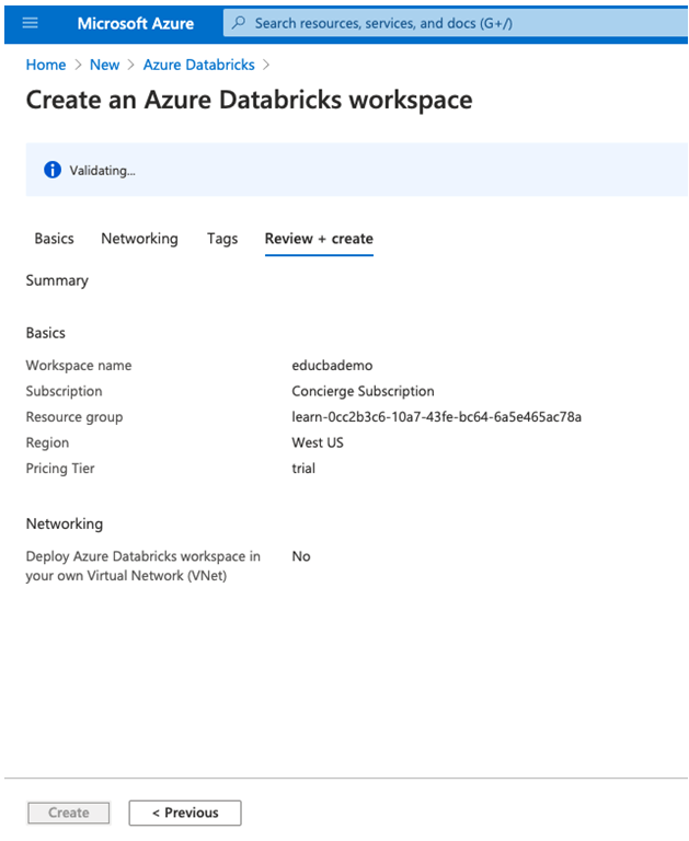 Step 7: Select review+create and then click on create from the page to deploy the workspace.