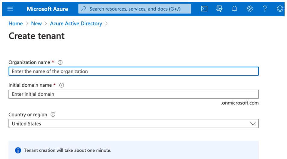Step 6: Enter the tenant detail as below and Select Create button to create a new Tenant: