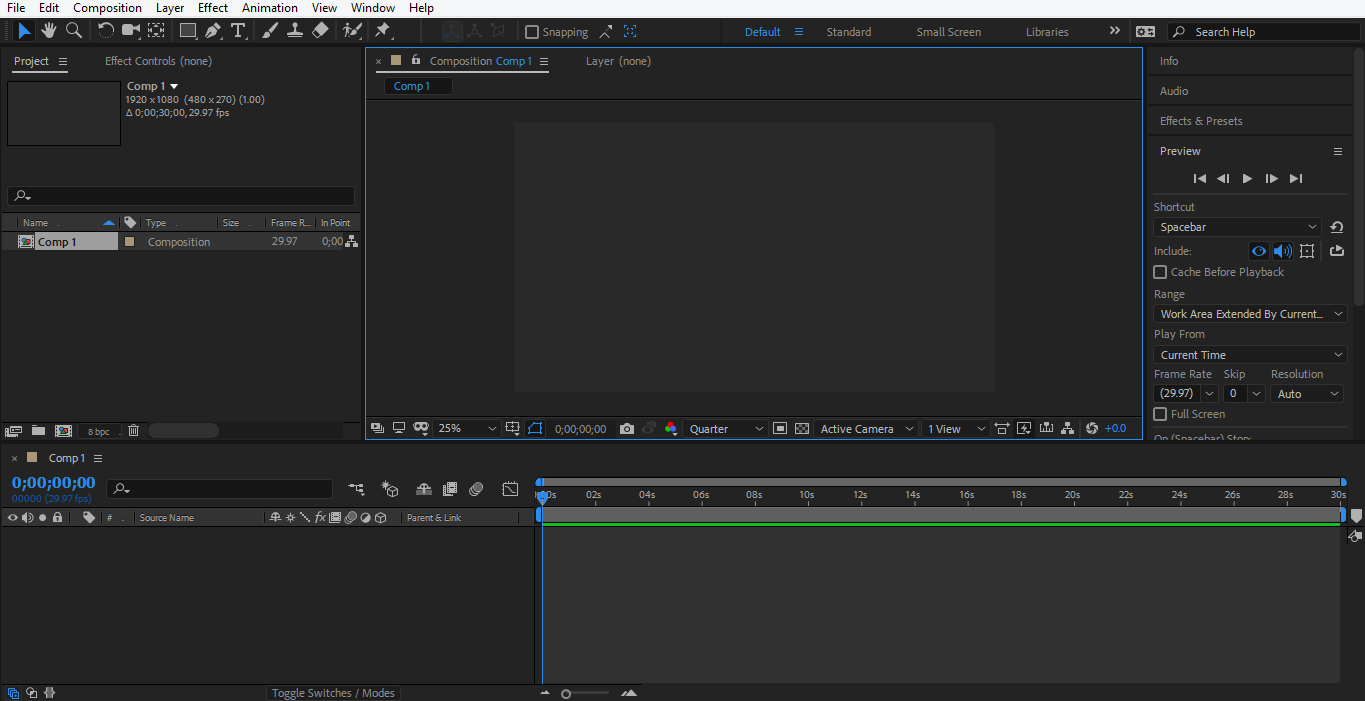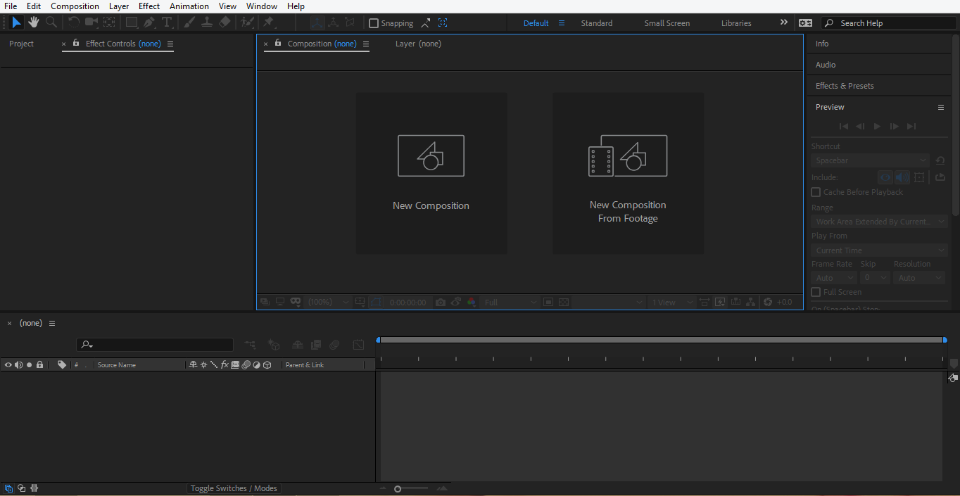 - This is the user interface of adobe after effect software. We have a different section in our user interface: composition area, layer area, keyframe area, tool panel, etc.