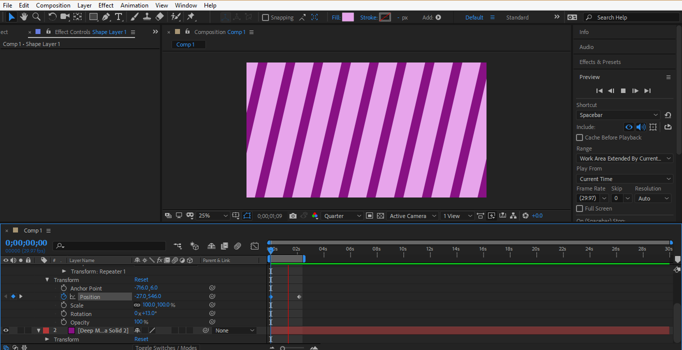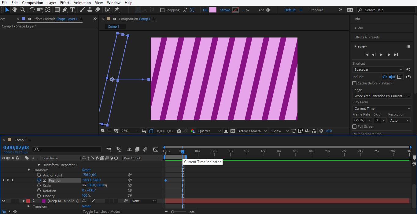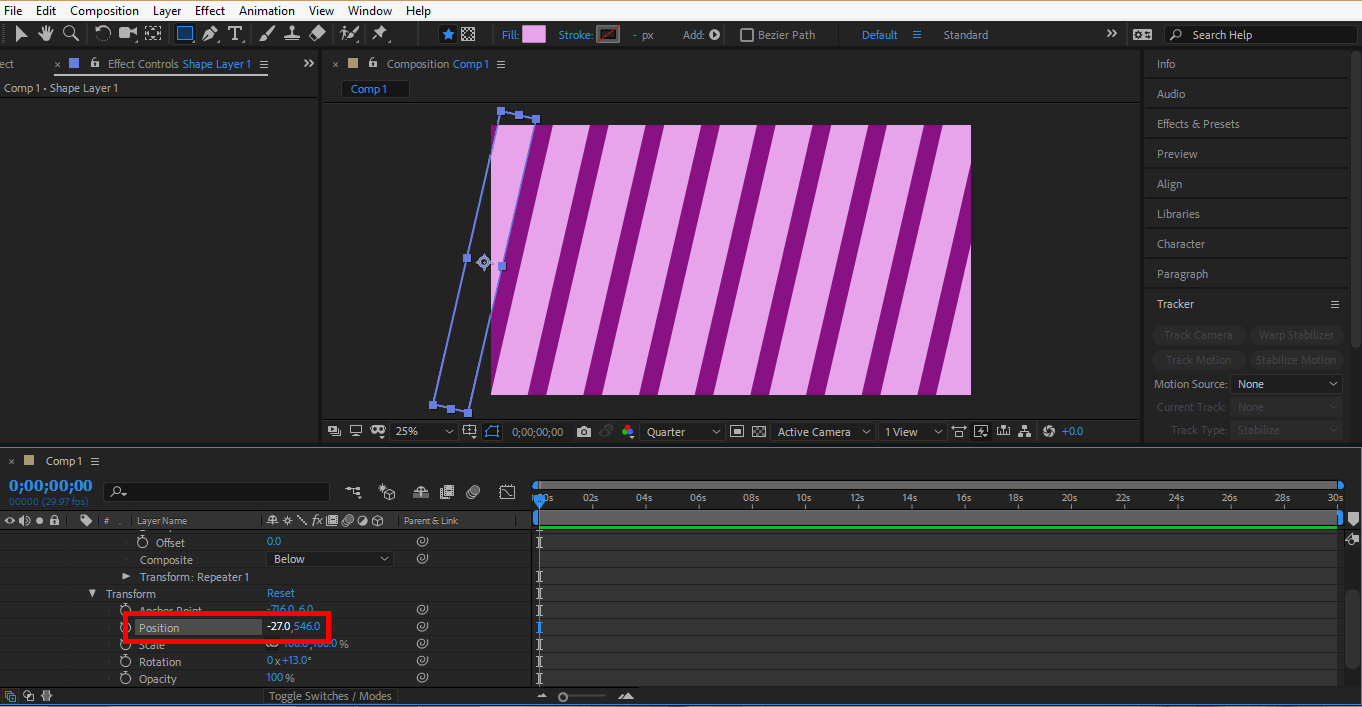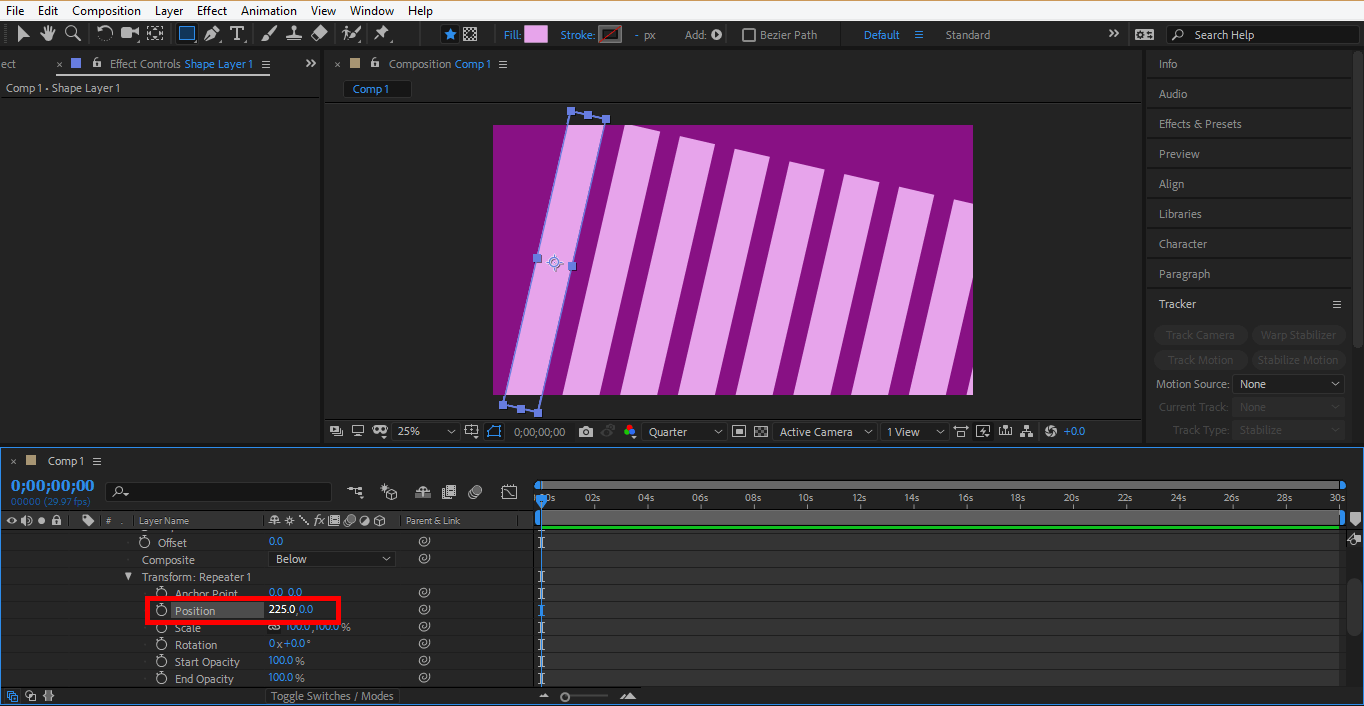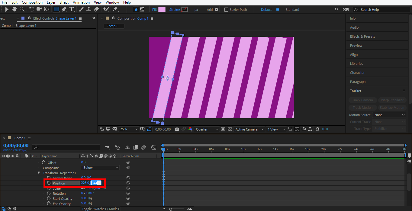 Step 34: Now, we will animate the position of the repeater. Click on the clock icon of the position to generate a keyframe for animation.