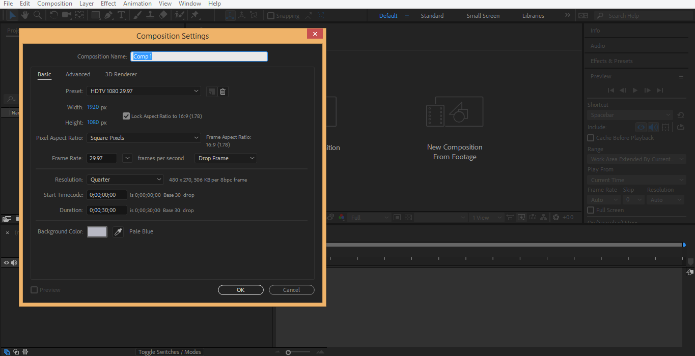 Step 4: Here, you can set some parameter of composition that is the name of the composition, size of the composition, the color of composition, duration of the animation, and then click on the ok tab to apply the settings. I will take the default parameter here for my composition.