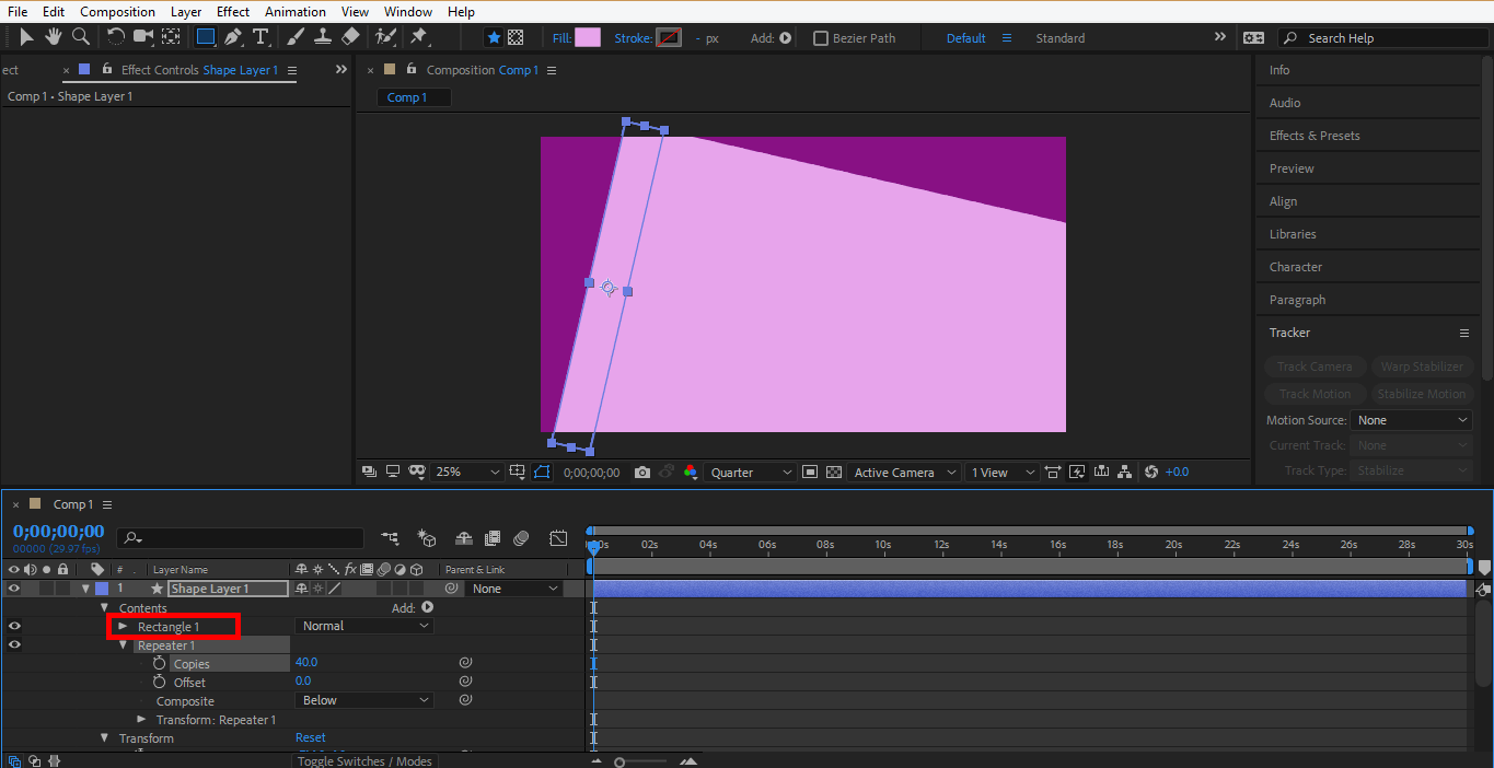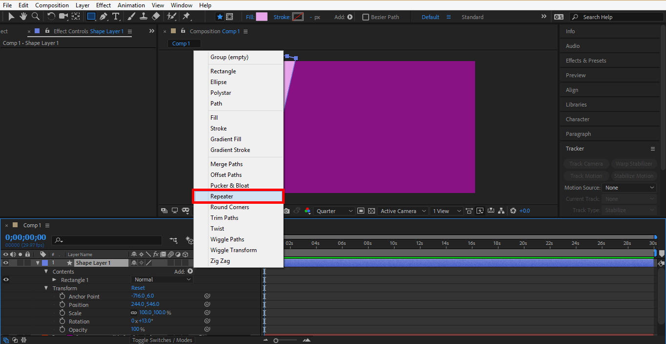 Step 29: Now click on Add tab at the layer section of shape layer 1 and click on Repeater from here.