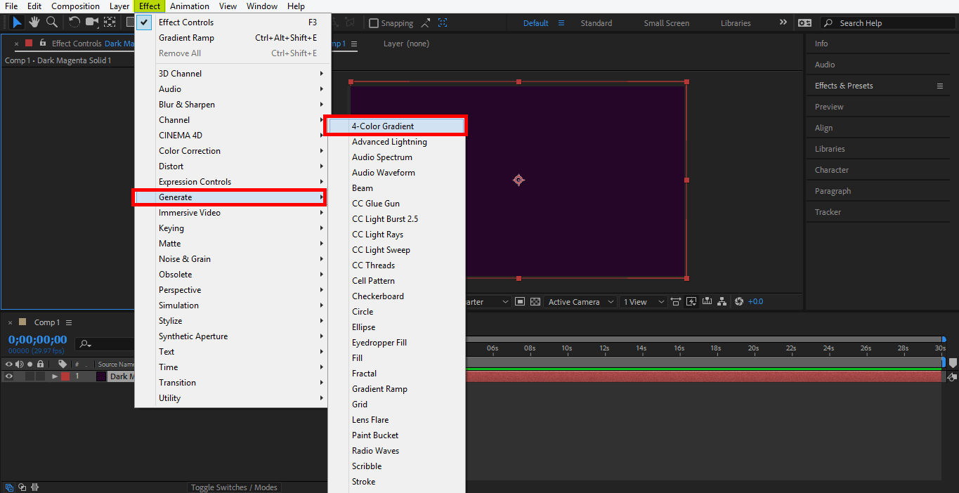 Step 13: Now, you can apply multicolor as the gradient in your background, go to the Effect option at the top of the work area, then go to Generate and click on 4-Color Gradient.