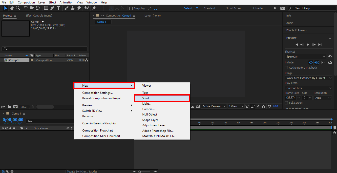 Step 23: Now, we will animate our background. Right-click on this section, then go to the New option and click on solid.