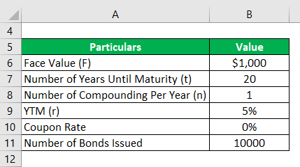 Let us take the example of deep discount bonds issued by ASD Inc. last week. The company will raise funds for its upcoming capex plans by issuing these 10,000 deep discount bonds. The face value of the bond is $1,000 and it is redeemable after 20 years. Calculate the price of each bond and the money that can be raised by ASD Inc. through these bonds if the YTM based on current market trends is 5%.