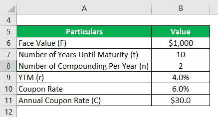 Let us take the example of another bond issue by SDF Inc. that will pay semi-annual coupons. The bonds have a face value of $1,000 and a coupon rate of 6% with maturity tenure of 10 years. Calculate the price of each coupon bond issued by SDF Inc. if the YTM based on current market trends is 4%.