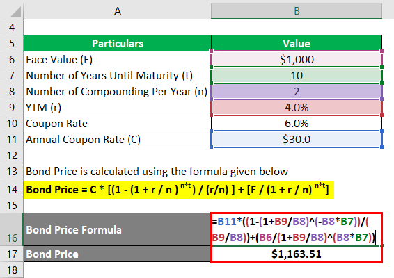 - Bond Price = $30 * [(1 – (1 + (4% / 2) )-2*10 ) / (4% / 2) ] + [$1,000 / (1 + (4% / 2) )2*10]