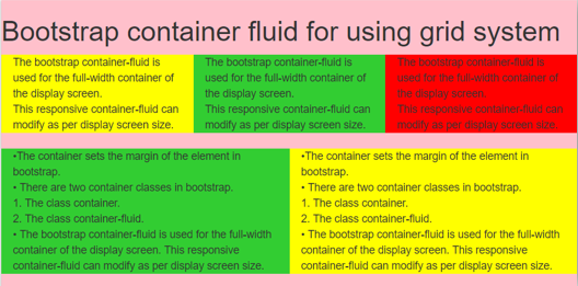 Explanation: The above output is multiple rows in one container-fluid class. There are used two rows to set different grid systems. The pink background shows the container fluid. The col-xs-4 class and col-sm-6 class used to make partition of row. The col-xs-4 class used for three columns in row and col-sm-6 used for two columns in one row. The column’s height set according to content size automatically.