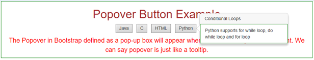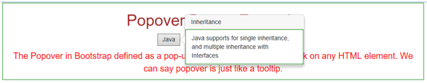 The Popover in Bootstrap, defined as a popup box, will appear when we click on any HTML element. We can say popover is just like a tooltip. The difference between popover and tooltip is tooltip can hold more content than popover. To include popover functionality in our application, we must include the js plugin on the HTML page.