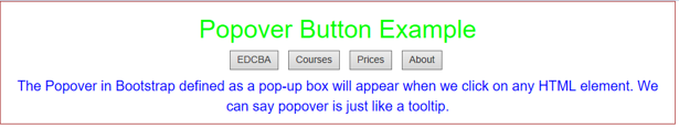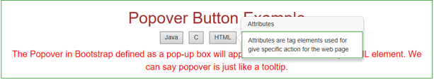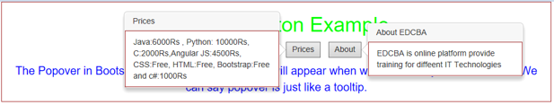 Bootstrap popover can be worked based on the element’s data-toggle=”popover” attribute. We can specify the title to popover by using the title attribute and also can specify the text inside the popover box by using data-content