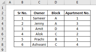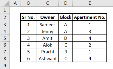 We have a data table with details of the Owner, Block, and Apartment No. Now we will frame the Borders and see what the data would look like.