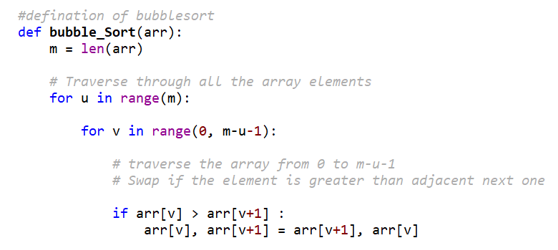 Here “m” is the length of the array. Two for loops hold the actual ground logic, where “u” represents the first element while “v” represents the second with which the first element has to compared for swapping if the sort order between both is not correct.