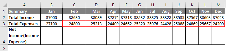 Now, simultaneously apply for other months, i.e., select cell E19, click the cell’s lower right corner, and drag it across to cell P19. Excel copies the function and border to the other cells.