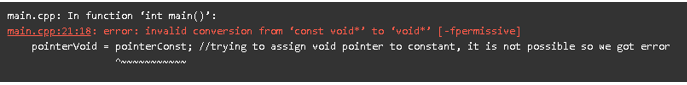 pointerVoid = pointerConst; //trying to assign void pointer to constant, it is not possible so we got error
