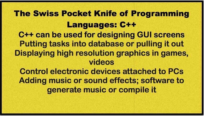 With C++, you can do so much more. So, what was C++ intended for? Well, Java was devised for controlling toasters, C for programming OS, Pascal to impart good programming methods, yet C++ is the Jack of All Trades and can be used across widespread applications.