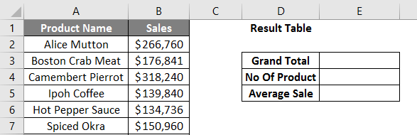 Step 2: Create headers for the Result table, Grand Total, Number of Product, and Average Sale of his product in column D.