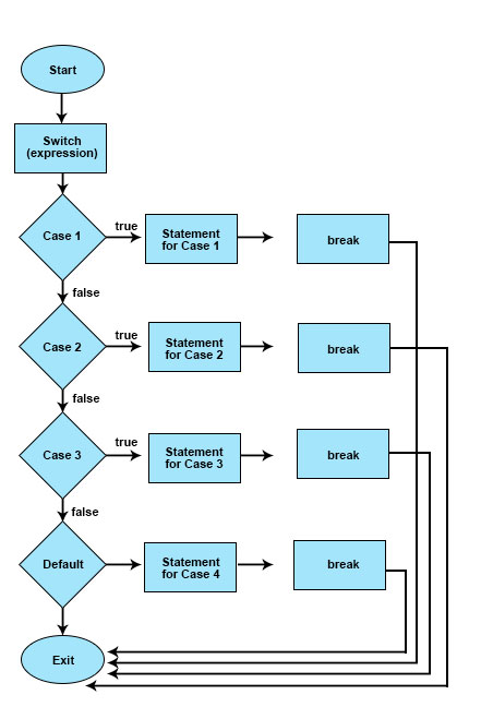 The above flow diagram clearly shows how the Switch and Case statement works in Java. It shows how matching the expression defined in the Switch statement is matched with the Case value starting from the top until the last steps. If the value is not matched until the last step, i.e. false’ is returned at the end of every case, then the code inside the ‘default’ is executed. If the value of any case is matched with the expression, i.e. return ‘true’ in any of the Case statements, then the code of a particular block is executed, and then execution exits the Switch block.