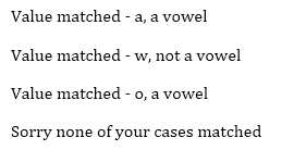 System.out.println("Value matched - a, a vowel"); case 'w':