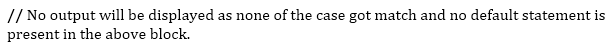 As described above, Case in a particular Switch statement is executed when the value of the expression matches with the Case value. If none of the value matches case values, then the default statement defined in the Switch block is executed; otherwise, nothing got executed.